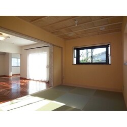 元々洋室だった部屋を解体し、1間半の間口を開口してリビングと繋げ、本格的な和室を作りました。元々の洋室のフローリングを剥がし、バリアフリーとする為に、厚み15ミリの縁なしの琉球畳を敷き込みました。これで敷居との段差も解消しました。また、天井は秋田杉の無垢材を格子貼りにして、檜材の竿桟で施工しました。壁は当初からこだわりをお持ちで、自然素材の珪藻土に藁すさを混ぜ、木製のこてで、塗りこみました。所々藁が壁から顔を見せ、非常に素朴な感じに仕上がりました。出窓は天板に特徴があり、高級座卓で使用するのと同じタモ材無垢の耳付きという物を使用しました。今お客様の方で、アンティークな襖を探されており、引き分けの戸袋に加工して納まれば完成です。お客様からは、一緒に作り上げていく楽しさや、考えた事が見る見る思った通り実際の物と成っていく満足感をご評価頂きました。