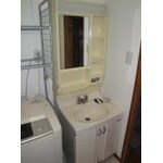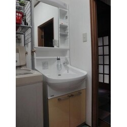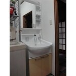 (旧株式会社アトリエ住まいるでの事例です。)クロスの色に合わせて白を基調とした洗面化粧台にしました。扉の色も薄い黄色にして明るい感じになり、ボウルも大きく使い勝手のよい空間になりました。