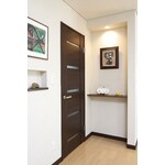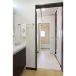 バリアフリーを考慮し、トイレ~浴室まで一直線に配置しました。隣地との気になる目線に配慮した窓の配置とし、通風、デザイン性を考慮しています。プラン段階で眠っている沢山の絵や小物を拝見し、お好みのイメージを把握。楽屋エリアと舞台エリアの発想で、脱衣室に壁面収納、旧トイレ部分に土間クロークを設置、隠す部分と見せる部分を明確にしました。