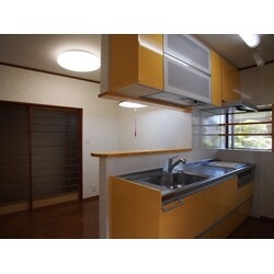 キッチンリフォームをさせていただきました。お客様のご要望対面式キッチンを採用させていただき、色も明るいビタミンカラーを選択されて、開放的で明るい空間に仕上がりました。