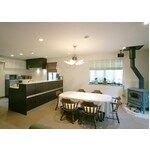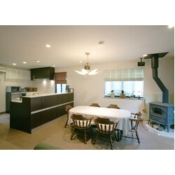 開放的なL字型キッチンは、収納たっぷりで余計な家具も不要になり、すっきりとした空間に。ダイニング側からは高めのカウンターで、テーブルを囲む家族の目線をさえぎりつつ、会話もはずむオープンなデザイン。お友達を呼んでのティーパーティーも楽しめます。珪藻土の白い壁や、アンティーク調のインテリアにあわせて、落ち着いた木目調をトータル・コーディネート。お客様こだわりの暖炉もセットして、ナチュラルなカントリーライフに大変身。インテリアもモダンなシャンデリア風の照明、室内のどこからでも良い音が聞けるステレオスピーカーなど、随所にこだわりとセンスが光ります。もちろん暖炉は使用できるので、暖炉の暖かさの中、ゆったりとした家族団らんの冬が過ごせそうです。
