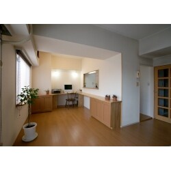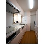 マンションのリビングとキッチン、そこにつながる廊下と洗面所をリフォームしました。タイルカーペットの床を剥がし、ウッディで暖かい色のフローリングに張り替え、カウンターを造作。キッチンカウンターは壁面にそってL字型に作り、支柱を収納棚にしました。以前収納が置かれていたスペースも解体し、カウンターに連なるようにワークデスクを設置。足元にも棚を作り書類等を収納できるようにして、照明も新設しました。電話やインターネットの回線などもデスクに引き、コードなどが綺麗に収まるようにしています。 キッチンとリビングとの間の壁はあえて拡げたり、壊したりせずそのままに。キッチンスペースは吊戸棚など収納と機能性を充実させ、リビングをスッキリとした空間を維持できるようになりました。 キッチンはLIXIL(サンウエーブ)社のIH仕様。パステルピンクのカラーが、とてもフェミニンな仕上がりに。料理中も明るい気分になれますね。