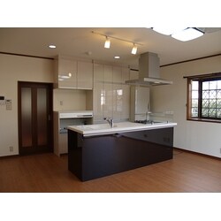 「見せるキッチン」として生まれ変わりました。ふだん使いの食器入れ、家電収納、冷蔵庫をキッチン廻りに配置するということで、今までのキッチンスペースの面積に納まるように収納&キッチンを配置しました。味付けとして照明機器も移動しダウンライトやスポットライトでアイランド型キッチンを美しく見せるように配慮しました。配色は既存のテーブルや家具にマッチするようにダークチーククを選定。対して壁面に背の高い収納機器は圧迫感が出ないようにホワイトチークにしました。