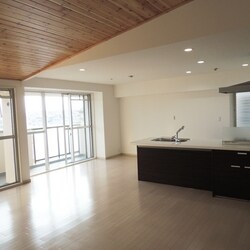 マンションを全面改装いたしました。 以前はリビングとキッチンをまたぐように和室があり、せっかくのバルコニーからの眺望を邪魔していました。最上階という好条件を活かし、眺望と採光を最大限に生かした間取りに変更。 無垢材をふんだんに使用した優しい空間に生まれ変わりました。 対面キッチンの向こうに広がるリビングは杉材を使用したゆるやかな勾配天井。無垢材の優しさとバルコニーからの柔らかな光がリビングを包み込みます。