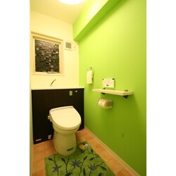 (旧株式会社ハウスドゥでの事例です。)テラコッタ調のクッションフロアに、爽やかなグリーンのアクセントクロスをポイントにオシャレな空間を演出。