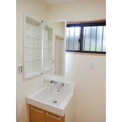 左側の鏡を開くと中は棚になっており洗面用具を置く事が可能。鏡は内側にも張っているので洗面を使用際は扉を開け、使用しない時はコンパクトにと機能性溢れる洗面を提案しました。