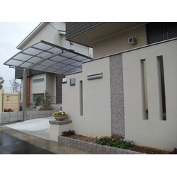 落ち着いた色合いの新築建築の外構工事です。 玄関正面には目隠しを兼ねた塗壁仕上のデザイン門塀(表札・ポスト・照明付き)を配置。 カーポートとテラス屋根(竿掛け付き)・タイル貼りのガーデンテラスもつくりました。 雑草対策と防犯にも考慮し、建築周囲には山砂(砂利)も敷いております。