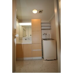 洗面台、洗濯機、収納を一列に配置することで、脱衣スペースを確保しました。マンションの水廻り設備は排水勾配や配管経路の制約多く、プラン段階で念入りに調査し提案いたしました。