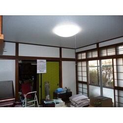 天井は重ね貼りにクロス仕上げで解体を最小限にしました。ジュラクを撤去し、クロス仕上げで明るい居間になりました。襖もかわいいクロスをはり、イメージチェンジです。