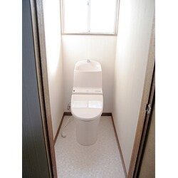 便器はウォッシュレット一体型で高さ80㎝の使い易い手洗いを備え、また深くて広いボウルタイプなので手が当たらず、水切り動作をしてもまわりに水はねしにくい形状です。