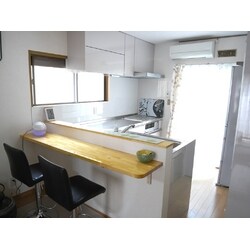 洗い物をするとき西日がまぶしいというお声からL型のキッチンにしました。収納性や調理スペースも大幅にアップ!カウンターをつけ、来客時や軽食時に利用。おしゃべりを楽しみながら料理できるキッチンになりました。
