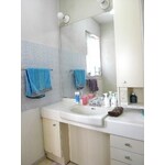 ボウルが小さくて洗いにくくかった洗面化粧台。奥様が一目で気に入ってしまった、透き通ったブルー人工大理石の洗面化粧台クリナップ ティアリスに。大きなボウルと高級感のある一面鏡。引出し収納も充実しています。正面についていた室内照明も天井照明に移動しました。