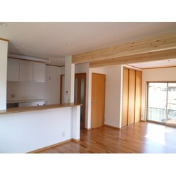 隣接するLDKと和室を一体化するため、仕切っていた押入を撤去しました。柱を抜くために補強で入れた集成梁が、インテリアのアクセントになっています。キッチンも若干広くし、背面にカップボードを設置して収納力を大幅にアップしました。