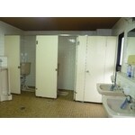 3.1×3.4m四方の空間に、和便が2台と用具庫のブース、小便器が3台と手洗いがありました。間仕切る前は広く見えますが、男女で仕切りその中で更に個室に仕切ると、かぎりあるスペースの有効活用が求められてきます。扉の向きや位置、ブースの配置・壁の角度など、使い勝手に気を付けてプランしました。また、電気の容量にも制限があったため、一度に複数の使用を想定すると、消費電力の小さい器具を選ぶなどの注意も必要となりました。白を基調に清潔感のある空間になりました。