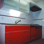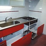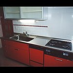 ずっと憧れていた赤いキッチンで台所への入口ドアも同じ赤にコーディネイトしました。今キッチン壁が主流ですが、タイルにして良かったと思っています。 重量感もあり、非常に高級なキッチンに仕上がって大変満足しています。