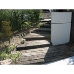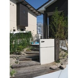 奥様といっしょになって色々とご提案させて頂き、出来上がりました。枕木を駆使したアプローチ階段、様々な種類の樹木たちがお客様をお迎えします。