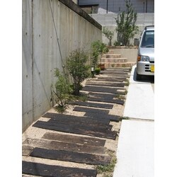 枕木とヴィンテージレンガ、土間コンクリートなどの材料を組合せ出来上がりました。