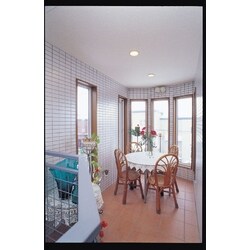 リビングの吹き抜け部分はつぶしたくないし増築は無理、壷などの骨とう品の収集が御趣味の奥様のご要望で、玄関吹き抜けをリフォームしてインナーテラスにしました。室内にタイルを使うのは水廻り以外では大変珍しいですが、外部空間をイメージした明るく清潔な印象の部屋になりました。