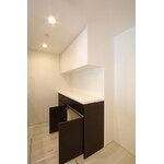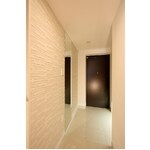 照明、カーテン、家具などのインテリアや、食器棚、エコカラットなどをご提案させて頂きました。白いフローリングに濃い色の建具という内装でしたので、家具も濃い色で引き締めてモダンな雰囲気にまとめました。各居室や玄関に貼ったエコカラットは、デザイン性に優れているだけでなく、調質効果、脱臭効果などの機能にも優れた人気の建材です。