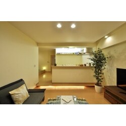 間接照明をメインに使い、他の家とはひと味違った雰囲気に仕上げました。 スキップフロアで一段上げたキッチンは、まるで奥様のステージのようですね! 壁に塗られた珪藻土とナチュラル色の建材により、部屋をやわらかく彩りました。