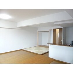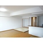 オープンスタイルのキッチンにして、視界が開けた、広々キッチン。 別々の部屋をつなげて、大きなリビングに変更。 和室は、畳コーナーに。クリーム色の畳が空間のアクセントへ。ちょこっと遊び心でガラスブロックをプラス。