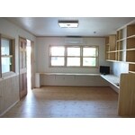 車庫をリフォームするにあたって大切なのは断熱です。車庫には断熱材が入っておらず、外気温とほぼ同じで夏は暑く冬は寒いため、壁・床・天井の6面体全てに断熱材を入れました。窓は既存の型ガラスを透明ガラスにし中庭の景色を楽しめるように、また内側にサッシを入れたダブルサッシと、断熱性能のあるハニカムスクリーンで仕上げることをご提案いたしました。憩いのスペースまでの道はなだらかなスロープにし、入り口には車イスの乗り降りのしやすいベンチと、手すりを取り付けました。3畳ある畳スペースは収納機能付き。端に座ってテレビを真正面に見ながら寛いでいただけるよう、あえて段差をつけてあります。 事務所との仕切りには3枚の引込み吊戸を採用しました。