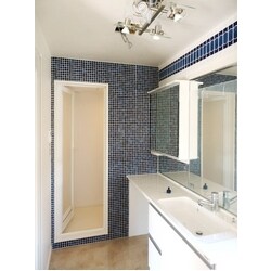 洗面空間のユニットバス側の壁に、ブルーのモザイクタイル(モザイコ23角)を貼り、洗面台の上にはお客様がご自身で見つけてこられたアクセントタイルをいれ、その廻りに10cm角の白いタイルで囲います。ホワイトとブルーで統一されたオシャレな空間になりました。