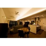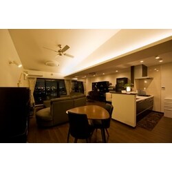 お施主様は服飾のお仕事をされているという事で、たくさんの衣服を収納したいというご要望や、趣味のネイルをご自宅でできる様なリフォームをご希望されていました。マンションの最上階という事で景色もよく、もともとの勾配天井も利用し、間接照明のご提案もさせて頂きました。天井に光を当てる間接照明を、コーブ照明というのですが、天井に光をあてることで、天井の白いクロスが光を拡散し、室内全体をやわらかな光が包み込んでいます。傾斜天井に光をあてたことで、天井がより高く感じられるようになりました。
