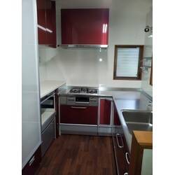 キッチンを奥様のご要望で新しくいたしました。 ステンレスの方がいいということで、既存の人工大理石カウンターから ステンレスカウンターのキッチンにしました。 完成後、奥様も大変喜ばれ、 「しばらくは汚したくないので、油ものは作らないように しようかしら」 とおっしゃるほどでした。 背面にある天井近くまであるシステム収納は カタログやショールームで見た時より、 圧迫感がありましたが、収納力は抜群です。 また、扉色も重厚感があるボーテレッドです。