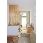 子育てをしながら、家で仕事をする事も有る若ご夫婦の為、LDKの一角には書斎コーナーを配置。冷蔵庫脇、書斎コーナーの緩やかな目隠しスリットは、既存の出窓カウンターと同素材で統一感を出しました。土間空間だった事から、床下からの寒さなどを配慮しつつ高さ方向で、空間の広がりを出せるよう天井高を高めに確保し、照明の配置も、ダウンとペンダントでメリハリをつけました。