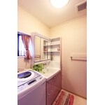スマートな高所用窓で明るく清潔感のある1F洗面室に