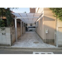 カーポートの屋根にあたる雨水がお隣にいかないような屋根形状です。