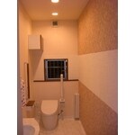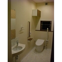 ご主人様のご病気をきっかけにバリアフリーで広いトイレに一新したいとのご要望がきっかけ。特に元々、大便器と小便器が間仕切りで分かれていたため車椅子のまま補助を行うご家族と2人で入るには物理的に不可能な状態でした。基本プランを作成するにあたってまず当社が行ったのはご主人が普段使用されている介護施設のトイレの現場調査でした。手摺りの位置や車椅子の車輪の回転半径など詳細に図面に落とし込み、出来るだけリフォーム後のトイレも同じような動作でご使用出来るようにプランを考えました。また最終的には壁クロスを調湿性とデザイン性の点からエコカラットに変更してモダンで使いやすいトイレに生まれ変わりました。 引き渡し後にはわざわざご主人に施設から来て頂きテストでご使用頂きました。その際、言葉ではなく満面の笑みとジェスチャーで「OK」サインを頂戴した時は本当に嬉しかったことを覚えています。