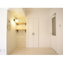 既存の床は濃い茶色のフローリングで暗い印象がありました。S様ご夫婦に似合う優しい色使いを心がけました。 全体的に暗いイメージがありましたので、照明の数を増やし、玄関ドアを開けたら光が迎えてくれるようセンサーライトを採用しました。 大きな梁がいくつかあり圧迫感がありましたので、気にならないよう、内装用タイルやクロスでアクセントをつけたり、デザイン性のある照明器具をポイントにしたり、目線を梁からそらすようにしました。
