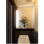 【お悩み・ご要望】 ●プラスチック製のシステムトイレは華奢で頼りなく飾り気がない。 ●時々トイレが詰まる 【リフォームのポイント】 ●快適性を求めて機能向上…床材は防汚・抗菌効果もあるハイドロセラフロアを採用。壁面には吸湿性に優れた珪藻土を取り入れました。 ●オリジナルなレストルームを目指す…無機質なトイレ空間への不満を解消しT様のお住いにしかない個性を追求したトイレリフォームです。 ●テーマは和モダン…縦横のラインを強調しつつ、ミラー部では映り込みを生かした遊び心も。 ●不満、不便を改善…リモデルタイプから少しでも高低差を出すために床上排水を採用し詰まりを改善しました。