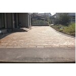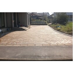 とても美しいインターロッキングが出来上がりました!お客様がお選びになったのは、エスビックの『ロシェ・アクア』というインターロッキングブロックです。こちらのブロックの特徴は、高い吸水性・保水性で路面を涼しく保つ効果があります。また、ブロック自体が蓄えた水分は、蒸発するときの気化熱放出でヒートアイランド現象抑制にも貢献します。一回り大き目のブロックサイズが、洗練された印象になりました。