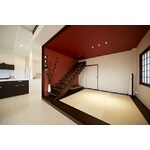 全体的に白を基調とした内装を希望されており、フローリングやタイル、建具などに白を用いる事により、和室の赤いアクセントクロスやお施主様が選ばれたオレンジのソファが際立ち、より洗練された空間になりました。