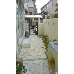 お庭の一角にバイクを置くスペースを作るため、植栽や花壇を撤去し足元にイエローの乱形石を貼りました。