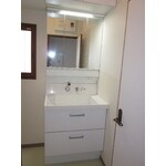 中古の戸建住宅を購入されて洗面台交換。大きな鏡で広々。