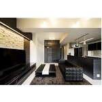 3LDKの細かく間仕切られたマンションを、寝室からリビングまでゆるやかにつながるワンルームへ大規模にリフォーム。 濃淡がはっきりした色調がお好みのお客様のイメージを汲みとり、個性的なタイルとコントラストを強調した異素材使いで、ご夫婦二人暮らしの理想の住まいを実現しました。