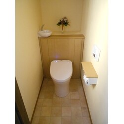 タンク付きトイレの後ろに棚がある、階段下スペースを利用したトイレでした。奥様の発案で便器設置位置が後ろに下がらないよう既存の棚を残し、レストパルスリム型を設置しました。 TOTOと設置の寸法計算をかさね、ご提案しました。 棚と棚の取り合いのむずかしい工事でしたが、職人さんの頑張りできれいにおさまりました。 既存の棚の上には壁柄と同じクロスを貼り、周辺の壁との一体化 ができたのでレストパル棚も引き立ちます。 コテ跡柄の入ったクリームの壁クロス、テラコッタ柄のクッションフロアーとレストパルの木質感、ピンクの便器と、お客様の ご希望を形にできました。 お掃除も楽になりますし、自動洗浄もつき、ご家族みなさんで喜んでいただけたら幸いです。