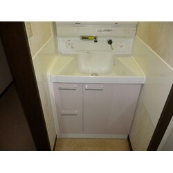 マンション用の特殊サイズからメーカー規格品の洗面化粧台へ変更。周りにキッチンパネルを貼り、水はねによるクロス汚れも解消しました。