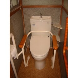 足が悪くなってしまった為、座る時も立ち上がる時も不便が ありましたので、トイレ用の手すりと便座の高さをあげる 【補高便座】を付けました。数cm高くするだけで、立ち上がりや座る動作がずいぶんと楽になったようです。 ピュアレストQR アプリコットF3A