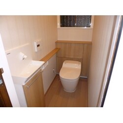(パナソニック ホームエンジニアリング株式会社での事例です。) 和式便器をアラウーノに取替え、床・壁のタイルはフローリング・クロス仕上げとしました。また、アラウーノ後部には収納キャビネットを取り付けました。(工期:4日)