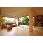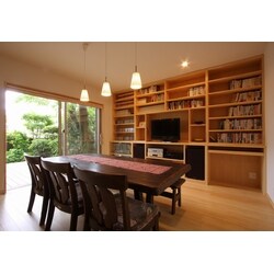 当初増築をご希望でしたが建ぺい率がいっぱいのため、増築なしでリビングスペースをつくるご提案をしました。 今回のテーマは「つながる」。 桜のある庭にはウッドデッキを、それを中心にリビングとダイニングがつながるようにプランし、内と外とのつながりを表現。 リビングソファ横の和室はあえて段差をもうけ、腰掛ければリビングベンチとして、人と人のつながりをつくる工夫を。 また、音とつながる、本とつながるという意味をこめてプランした壁面いっぱいの造作棚が、アカデミックな空間を演出します。