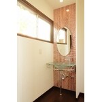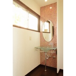 古くなった洗面所をオシャレにしたい!そんなご要望にお応えして壁にはモザイクタイルを貼り、丸い大きな鏡とガラスの洗面ボールでお洒落な空間に生まれ変わりました。