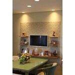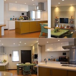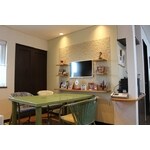 使い勝手、片付けを1番に考え、どこに何を収納するかを全て打合せし、更に家電(レンジ、炊飯器、テレビなど)も含め設計。リビングでくつろいでいる時、ふと眺めたくなるような間取りと奥様お気に入りの「ハニーイエロー」のキッチンから右手テレビまでの配色(黄色から淡い緑)キッチンから左手食器棚はキッチンが映えるようホワイトに配色し、斬新だけど落ち着く空間になるよう設計。