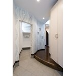 玄関とシューズンクローゼットとの間仕切壁は単純に平面的なRとするのではなく、2Fホールと連続させることで立体感を出すようにご提案した。そこに奥様お気に入りのステンドグラスを設置し、曲面にアクセントをつけた。 シューズインクローゼットはプライベート玄関も兼ねており、収納力と合わせて普段使いでもスッキリと暮らせるようにした。 R壁にすることでできた吹抜けにより、玄関ホールも明るくなり、階段も開放的になった。階段ホールの窓は大開口とはせず、敢えて小さくすることで足立美術館の『生の掛け軸』のような額縁効果を演出し、緑地帯の四季を楽しめるようにした。 工事中に一目惚れして飼ってしまった愛犬のために、設計変更してゲージスペースも造りました。