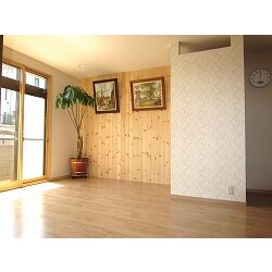 パイン材の羽目板が事務所を明るくナチュラルに演出。 また、天井を少し高くし、壁にはFIX窓を設けることで解放感をだしました。 さらに、玄関や階段の木もダーク色に統一することでスッキリした印象に仕上がりました。