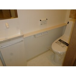 収納スペースがなく、老朽化もあり、ウォシュレット一体型トイレに取り替えました。手洗い器を設置したので掃除道具やトイレットペーパーの予備なども収納しておけてスッキリとなりました。